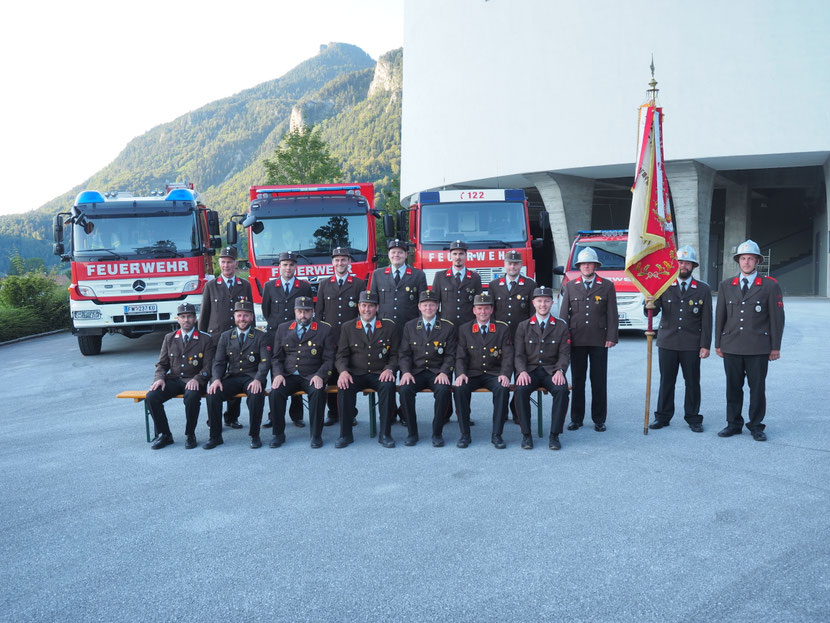 vordere Reihe v.l.n.r.: HLM Andreas Hörtnagl (Obermaschinist), OV Peter Moser (Gruppenkommandant), BI Georg Schindlholzer (Kommandant Stv.), OBI Andreas Kronthaler (Kommandant), OV Rainer Haselsberger, BI Helmut Pipp (Gruppenkommandant), OV Josef Kitzbichler (Schriftführer, Zugskommandant)
